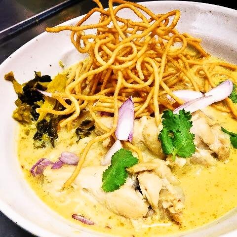 チキンと揚げ麺をトッピングした、タイ風カレーラーメンです。